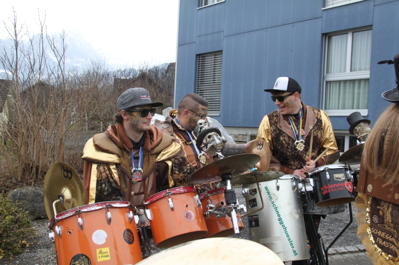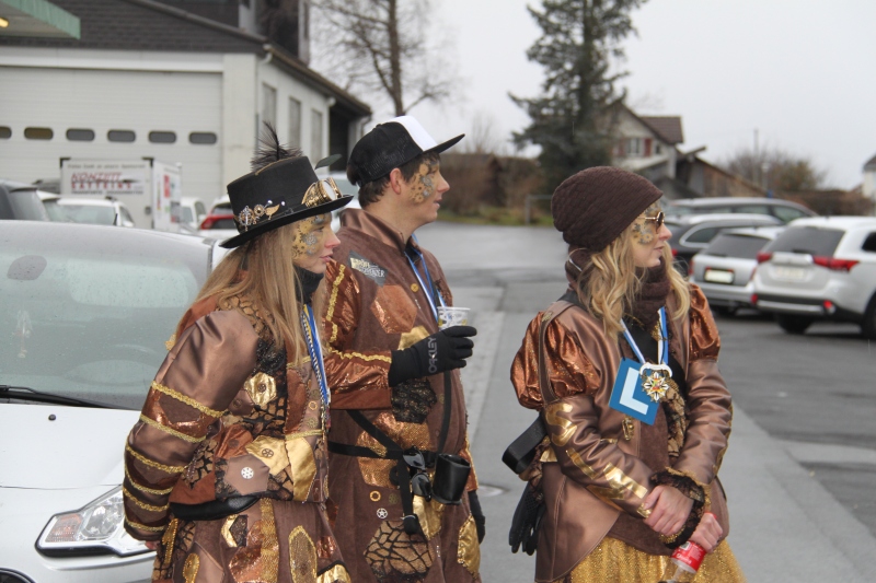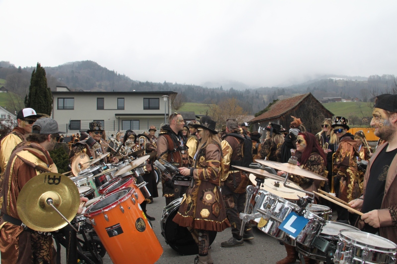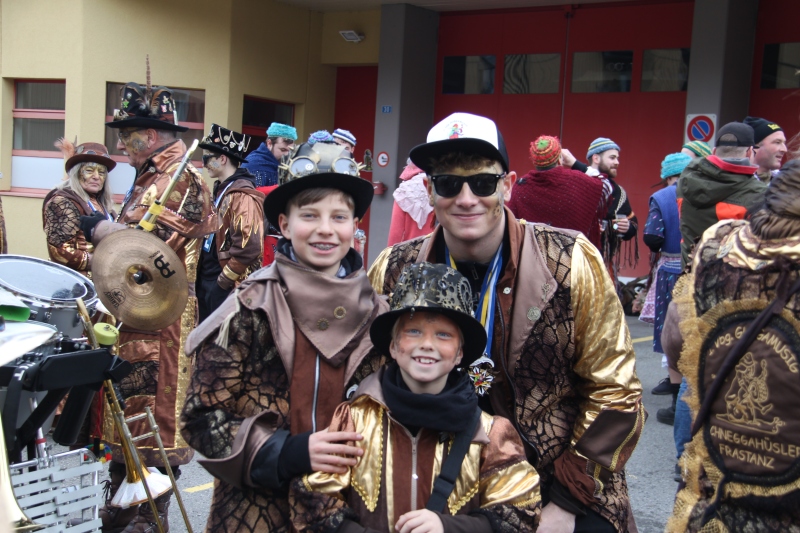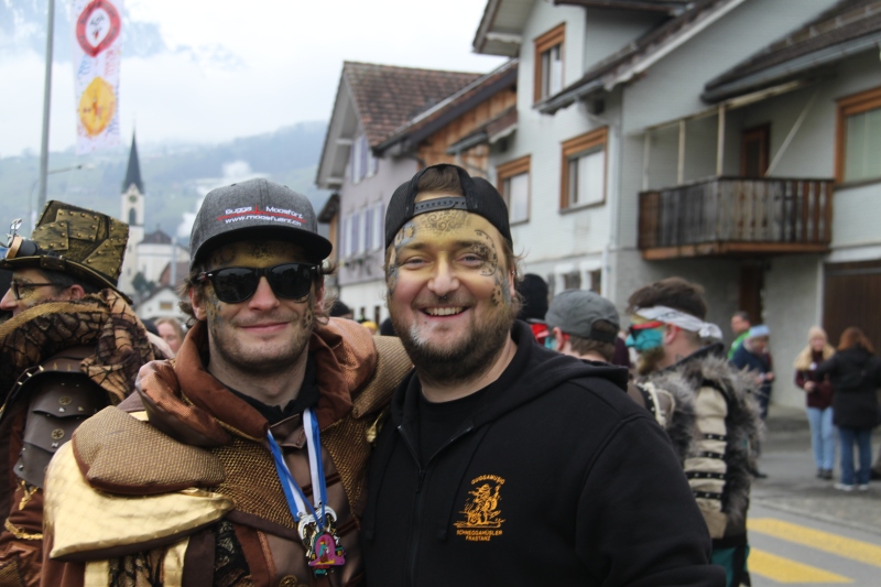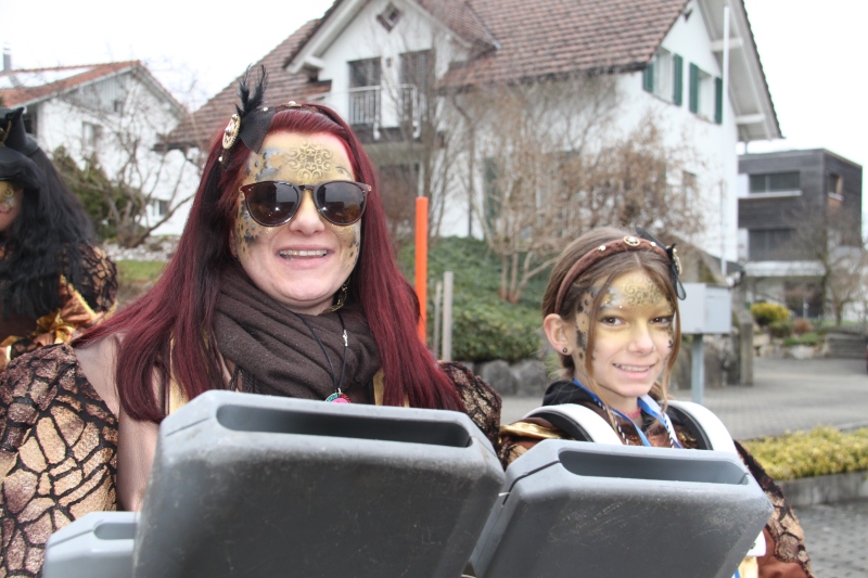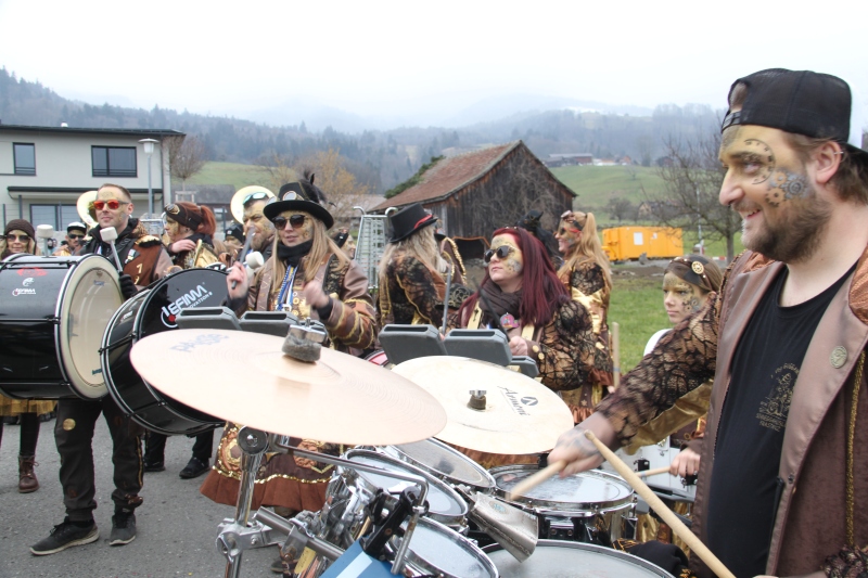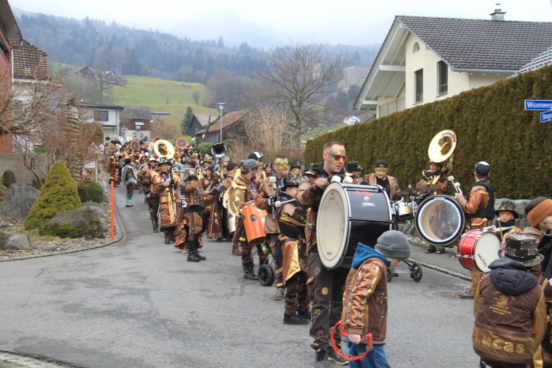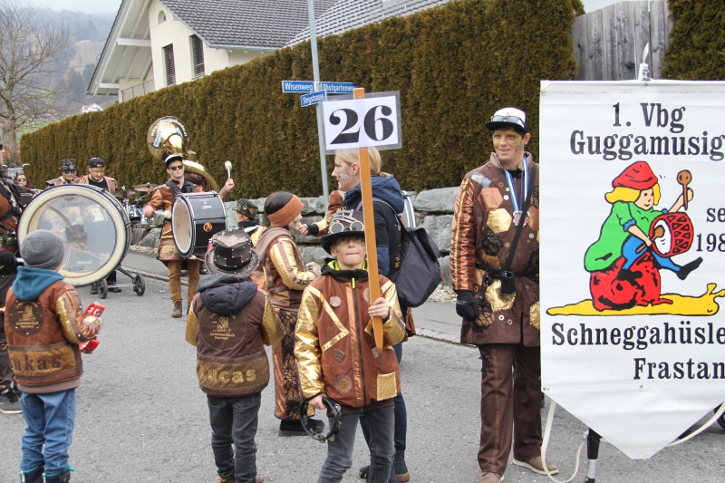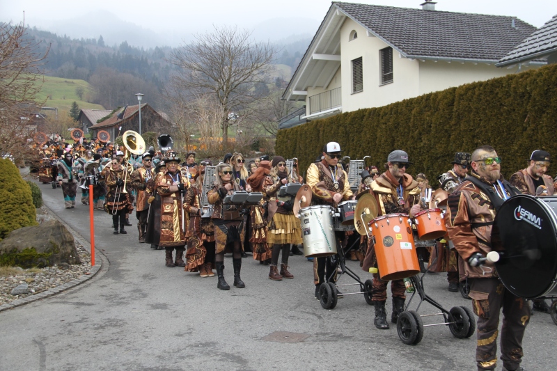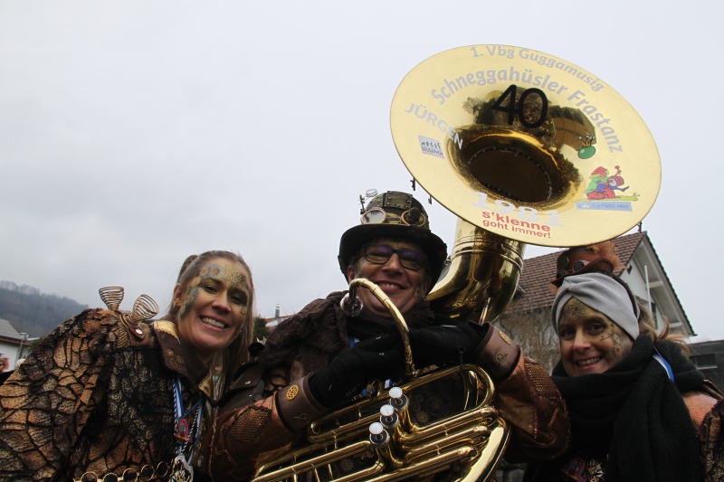 Umzug Gams Wieder einmal waren wir beim Gamser Umzug dabei, unzählig viele gut gelaunte und applaudierfreudige Zuschauer füllten den Strassenrand. Schnegg schnegg – Gugg gugg